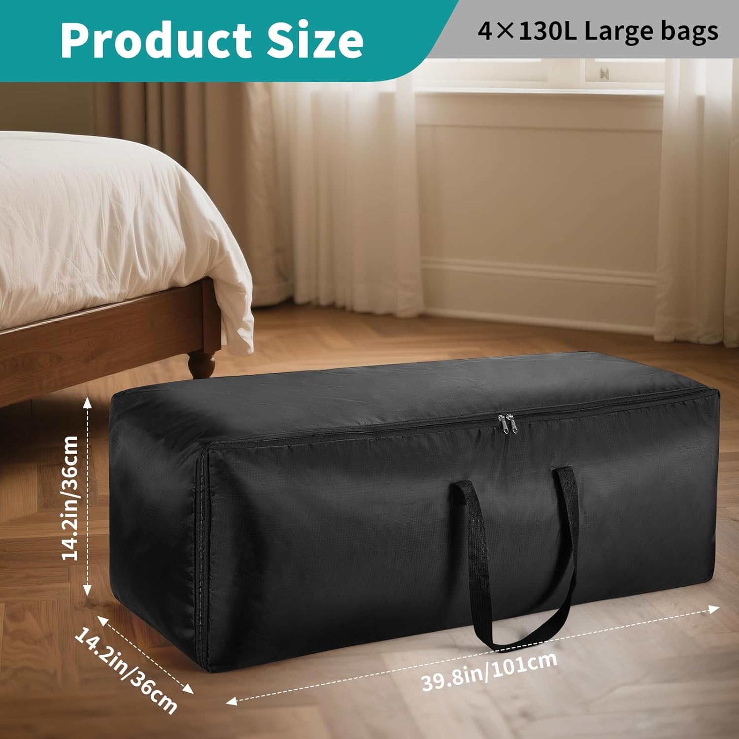 4 Pack, 130L, size: 101x36x36 CM / (40x14x14 Inch)The black Oxford fabric not only gives the bag a stylish look but also makes it dirt-repellent and practical for outdoor use.