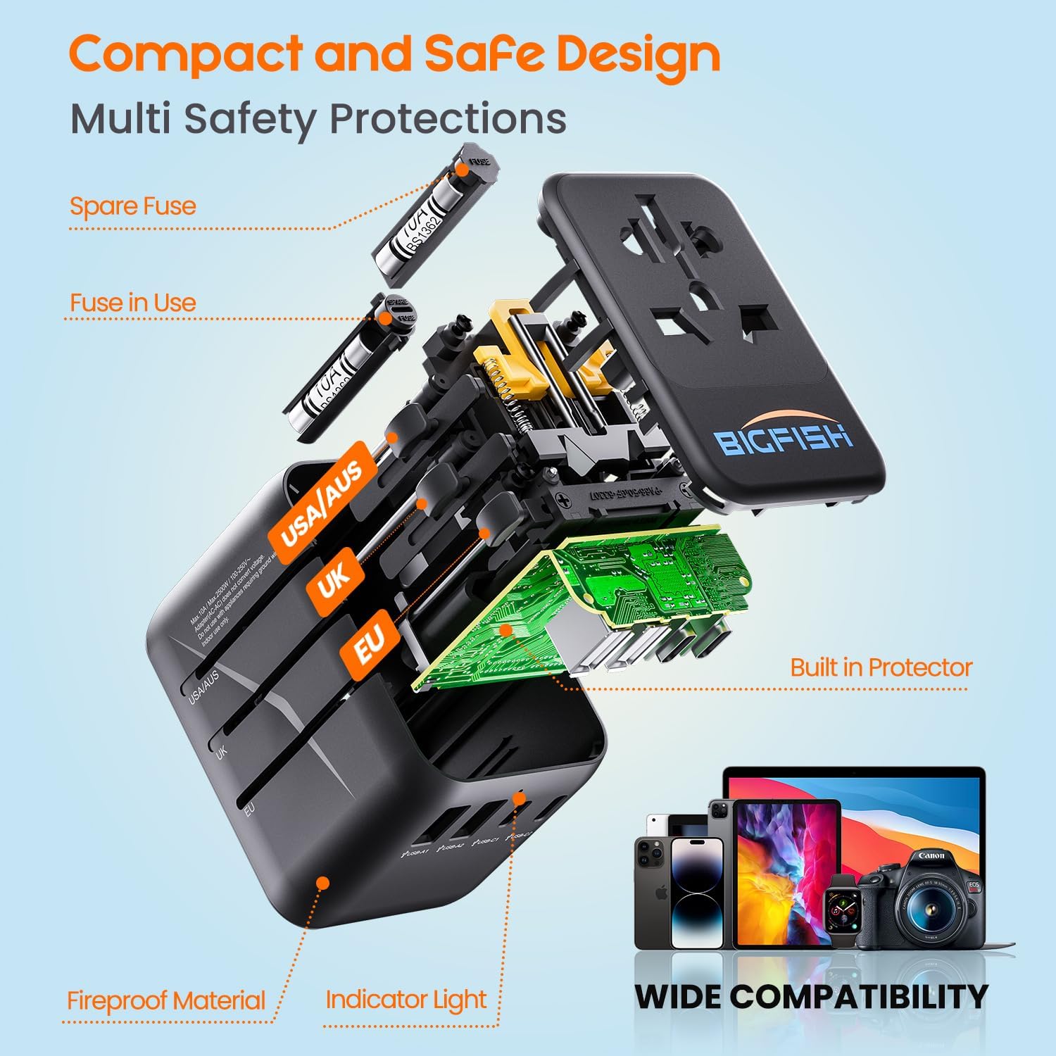 Bigfish Universal Travel Adapter, Worldwide Travel Plug Adapter with 2 USB A and 2 USB C, Dual 10A Fuses All In One International Travel Adapter – EU UK US AUS Plugs