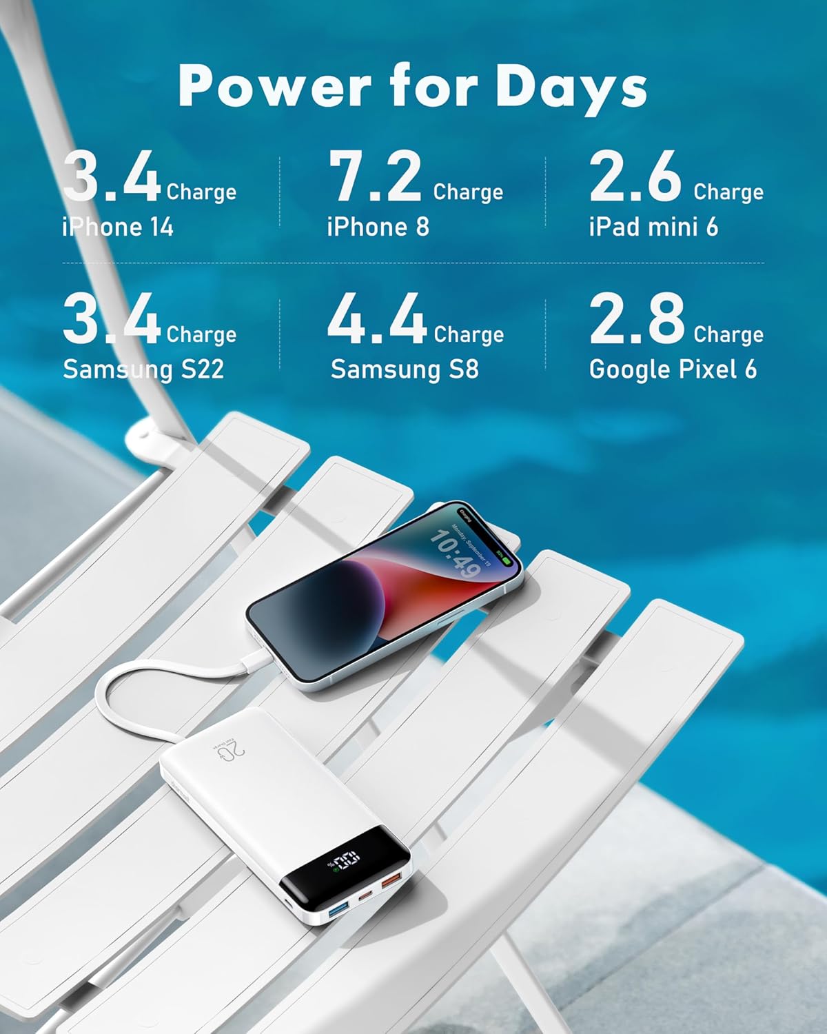 Charmast Power Bank with built-in Cables, 20000mAh Fast Charging 22.5W PD QC Quick Charge Portable Charger USB C compatiable with iPhone 17/16/15/14 Series, ipad, Android Phones (White)
