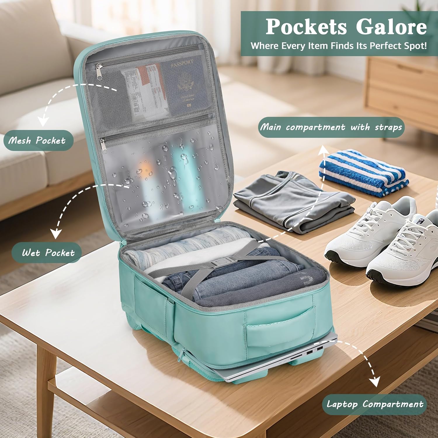 𝐋𝐨𝐚𝐝𝐞𝐝 𝐰𝐢𝐭𝐡 𝐏𝐨𝐜𝐤𝐞𝐭𝐬 𝐟𝐨𝐫 𝐎𝐫𝐠𝐚𝐧𝐢𝐳𝐚𝐭𝐢𝐨𝐧:The main compartment of this underseat cabin bag has straps to secure large items, plus a wet pocket and mesh pockets for dry-wet separation, a padded laptop compartment for protection, a water bottle pocket, and multiple zip pockets—keep every item in place