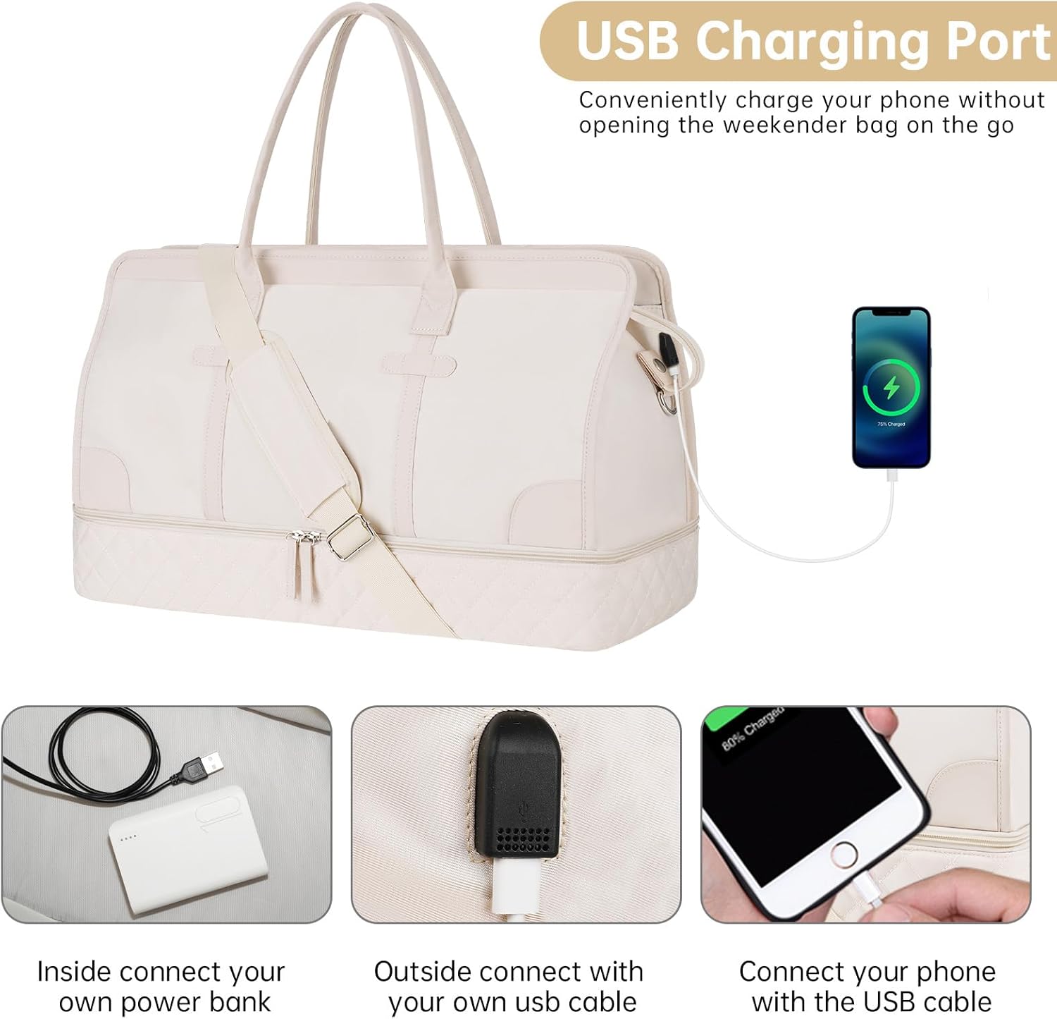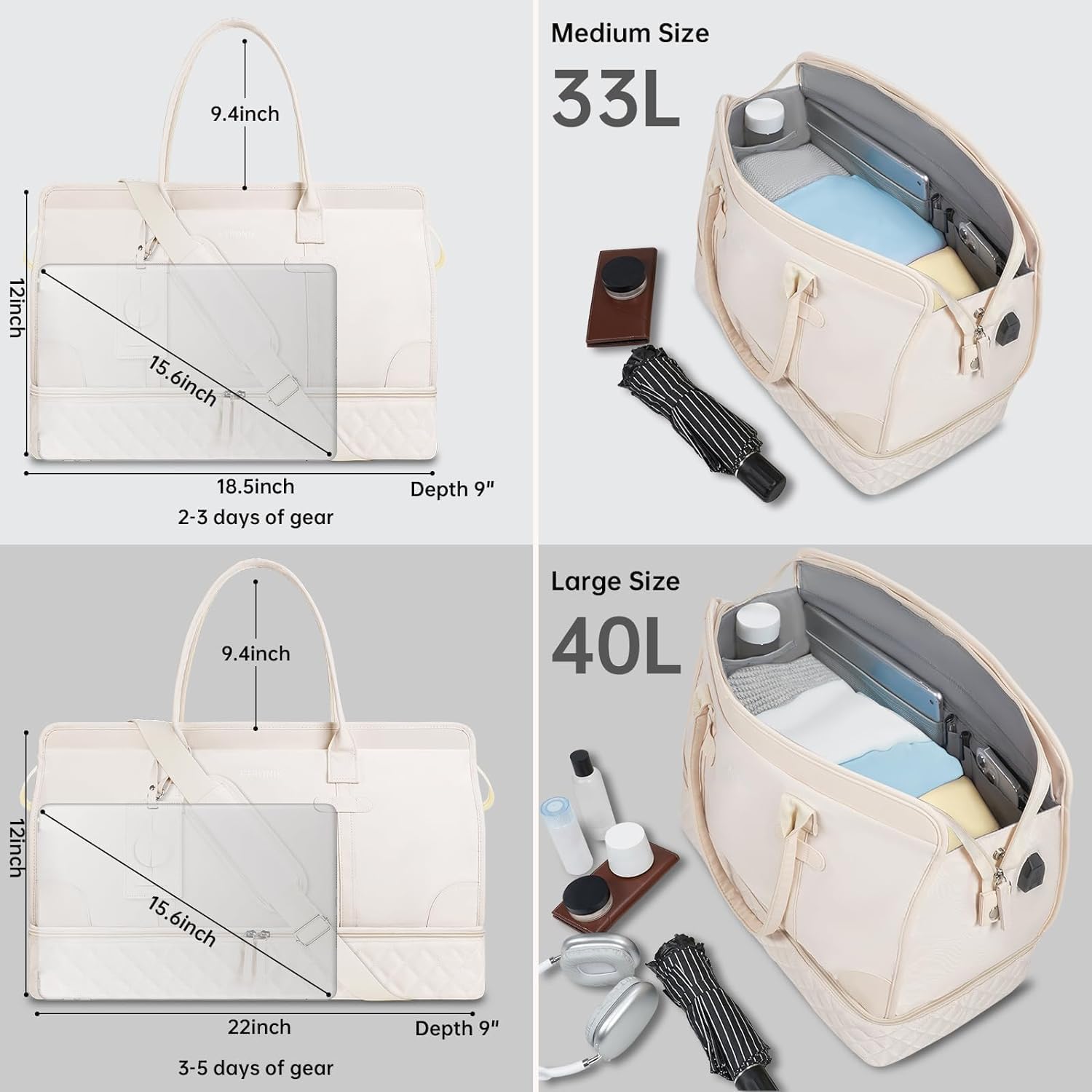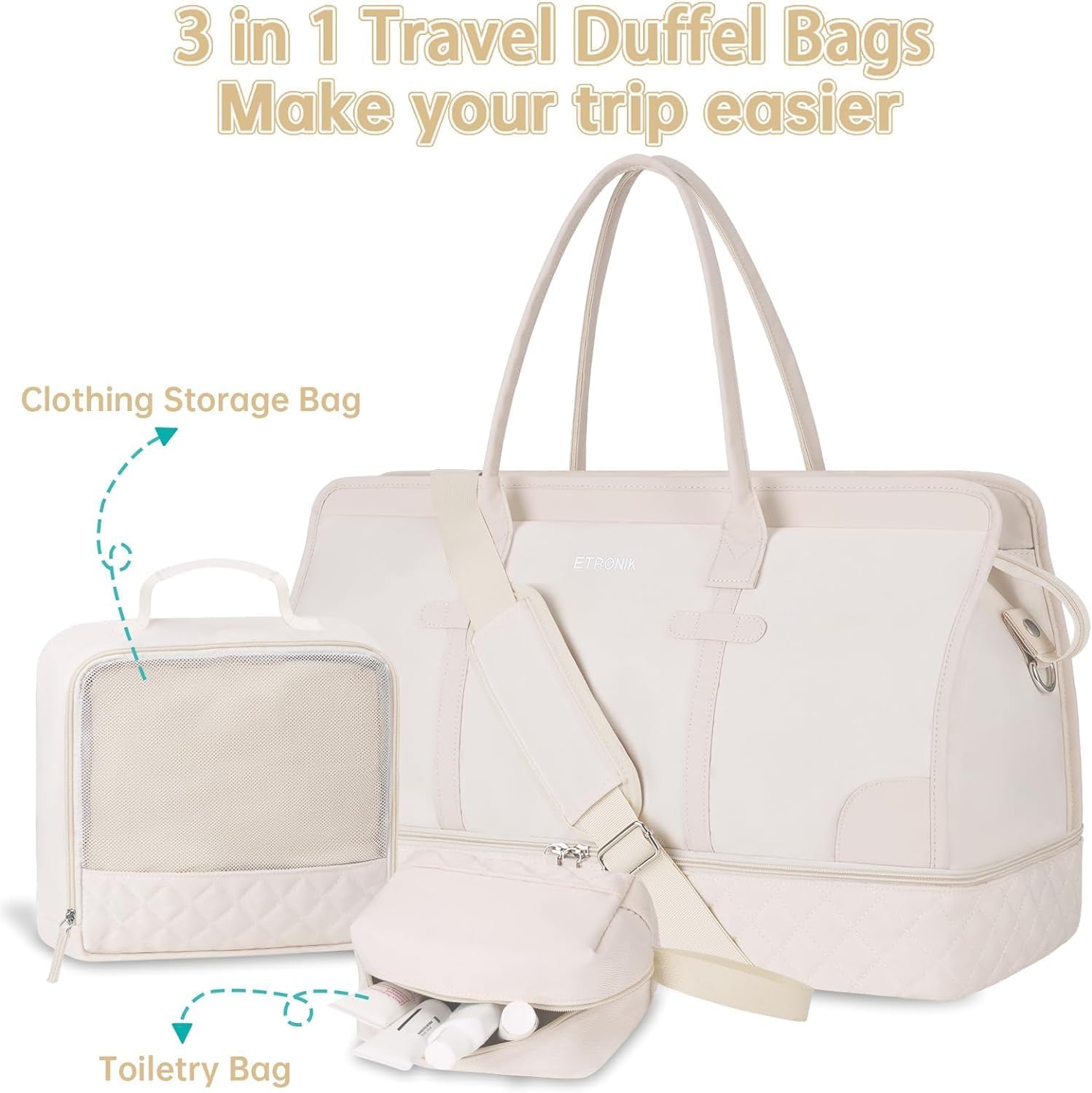 ETRONIK Weekend Overnight Bag for Women, Large Travel Duffle Bag with Shoe Compartment & Wet Pocket, Carry On Tote Bag Gym Duffel Bag with Toiletry Bag, Bag for Hospital 3 Pcs Set, Beige M