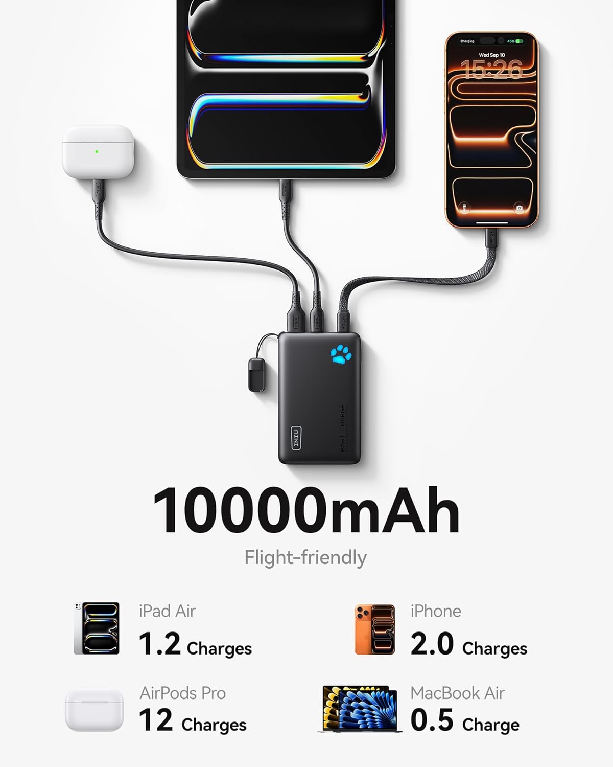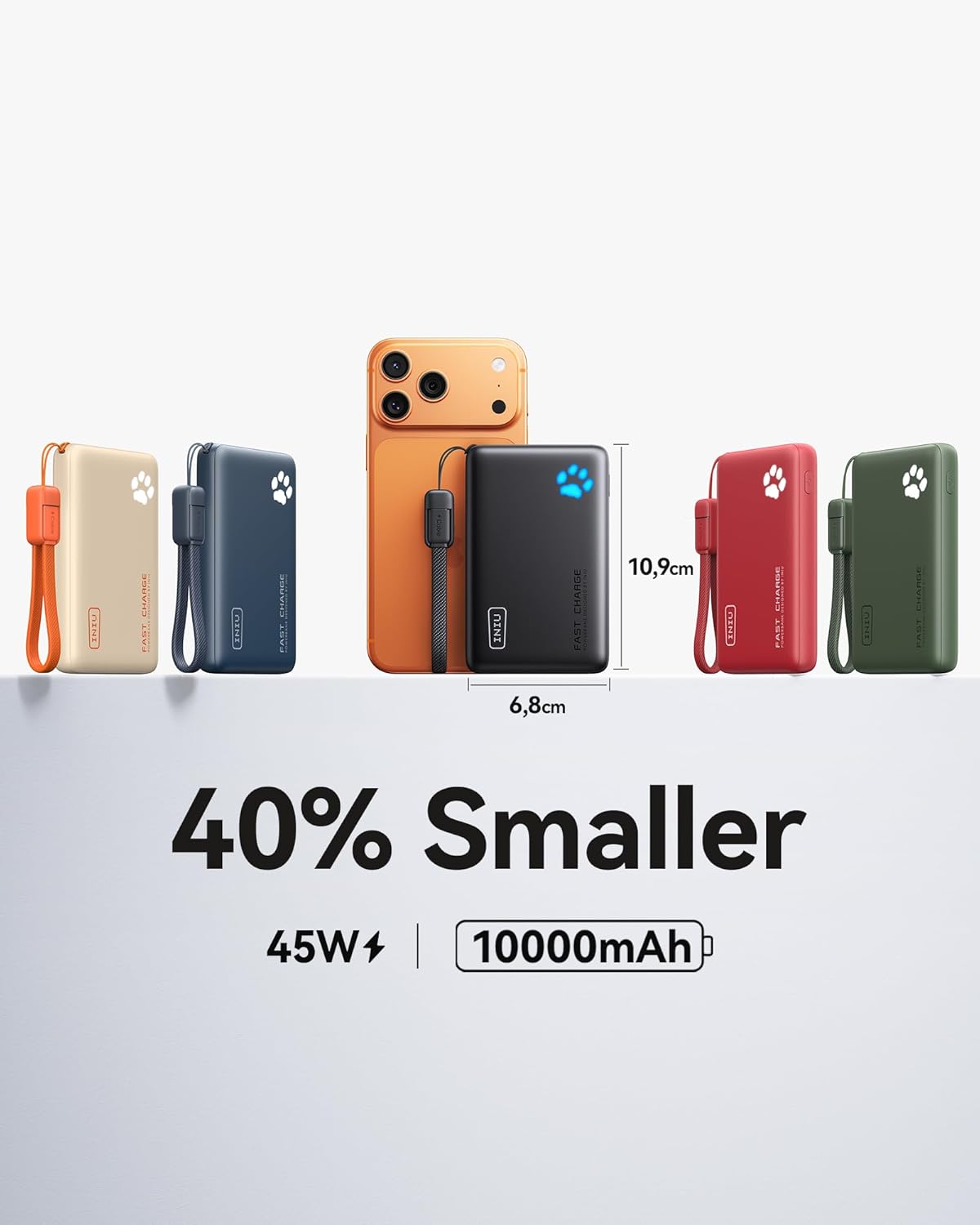 Industry First-Seen High-Density TinyCell: INIU’s latest 10,000mAh power bank features the market’s first high-density cell, making it 30% smaller and 15% lighter than others with the same capacity.