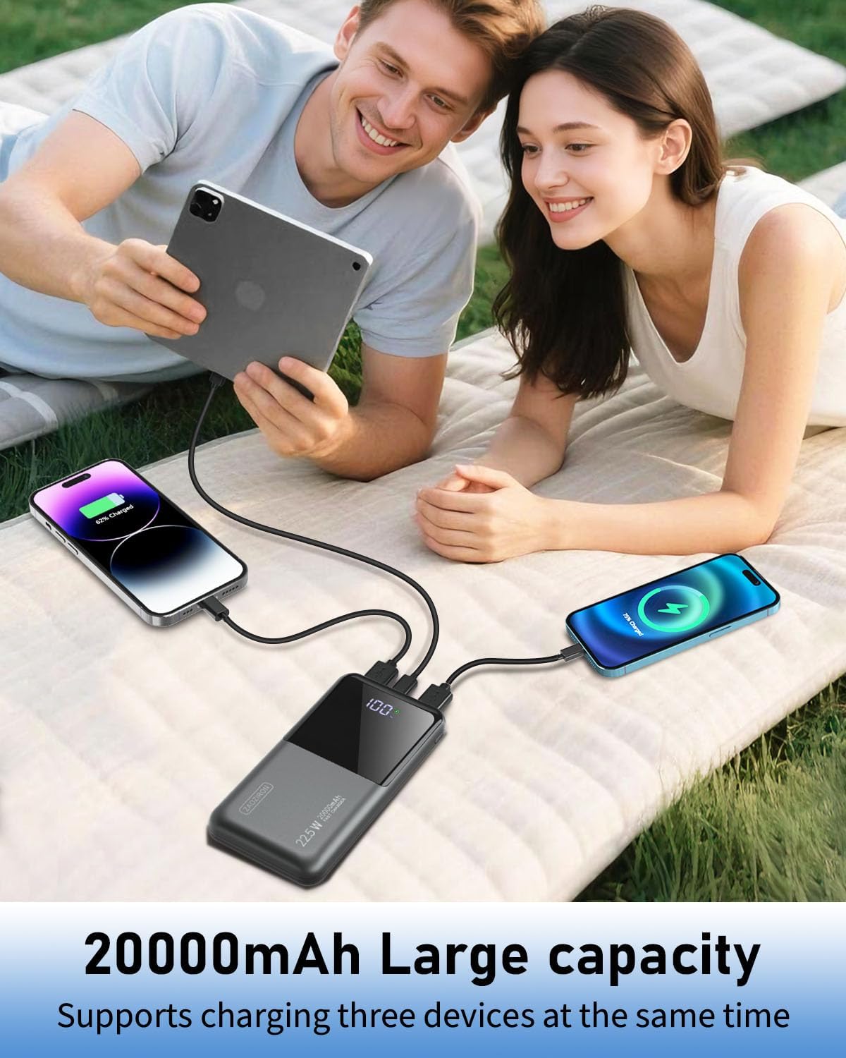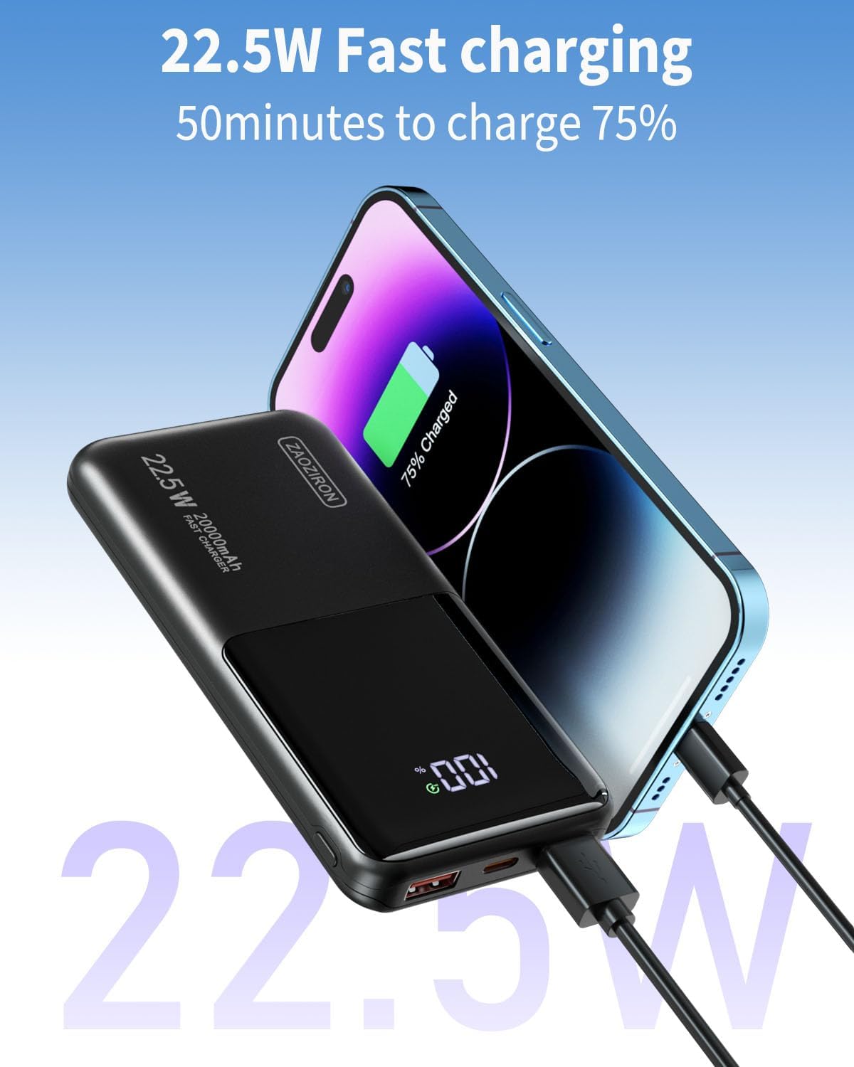 【Super fast charging】: Experience the power of 22.5W ultra-fast charging with this power bank, allowing youto recharge your phone by over 61% in just 30 minutes. The fast charging function of the portable power banksignificantly reduces the charging time of the device