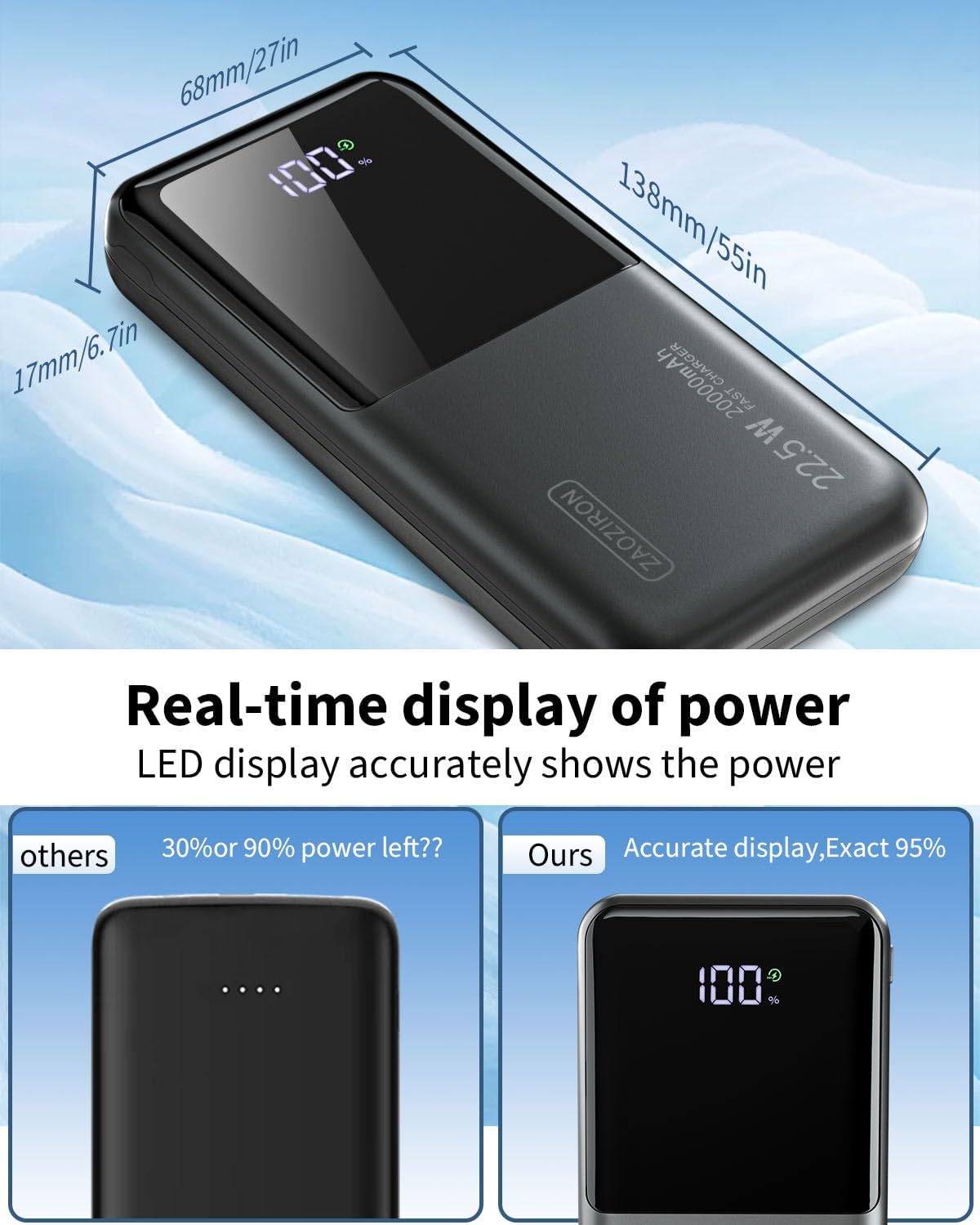 【LCD Digital Display】 : The newest fashion mirror design. LcD display shows the remaining powe(0%-100%), so you can more clearly grasp the remaining power and control the charging time. ZAOZIRONmobile power supply is suitable for almost all UsB-powered devices