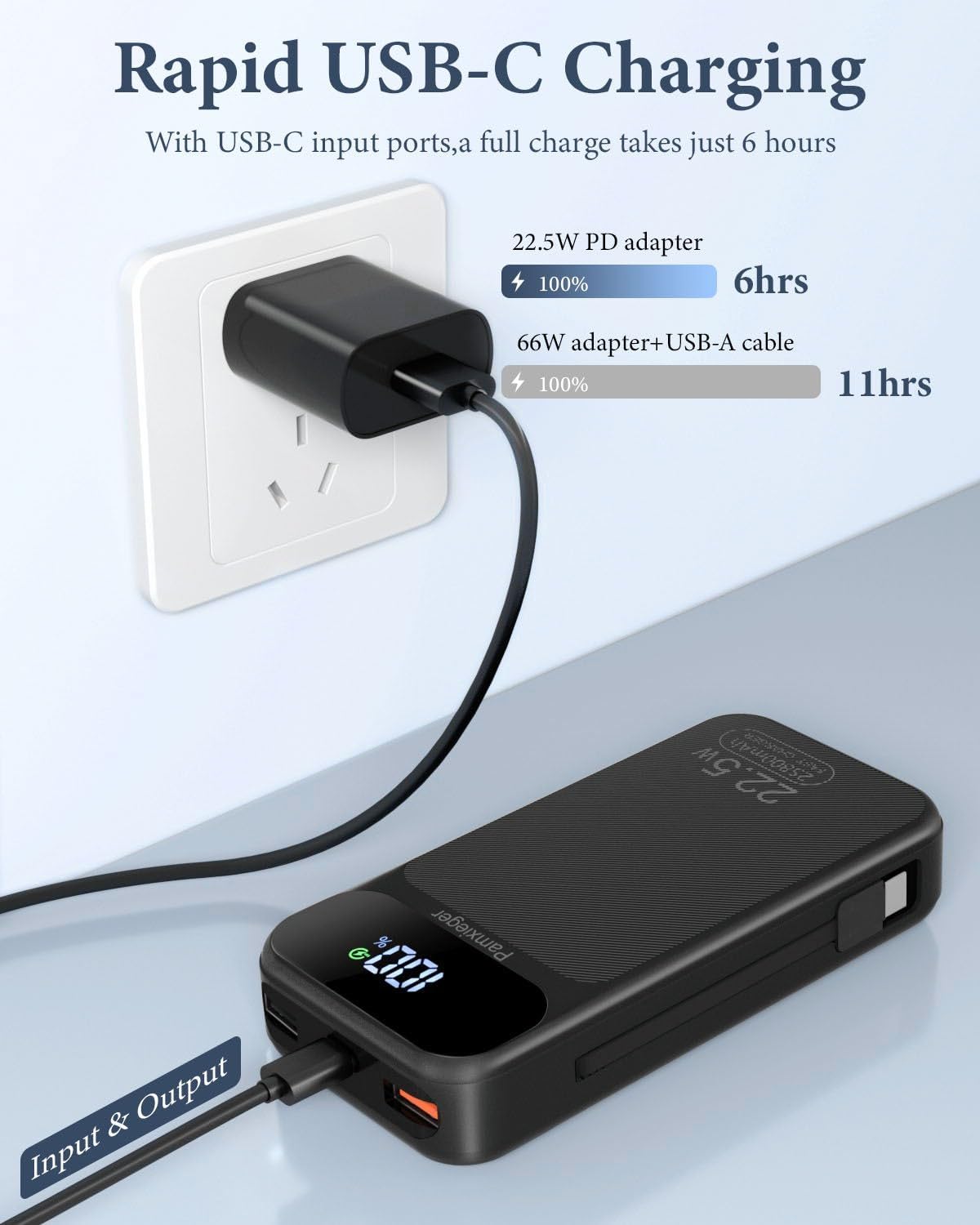 Power Bank 25800mAh Fast Charging Built-in 2 cables, 22.5W Portable Charger, Portable USB C Power bank Battery Pack with LCD Display Powerbank for Smartphones Tablets and More