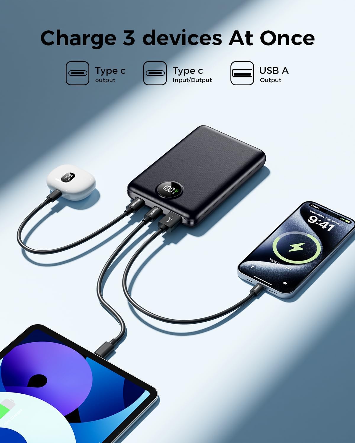 Charge 3 Devices at once: Share the power,innovatively designed with 1 USB-A and 2 Type-C multi-protocol fast-charging ports, it simultaneously powers 3devices. Charge smartphones, tablets, and earphones without waiting turns—perfect for group gatherings or family outings. Intelligent power distribution ensures optimal charging efficiency for each port.