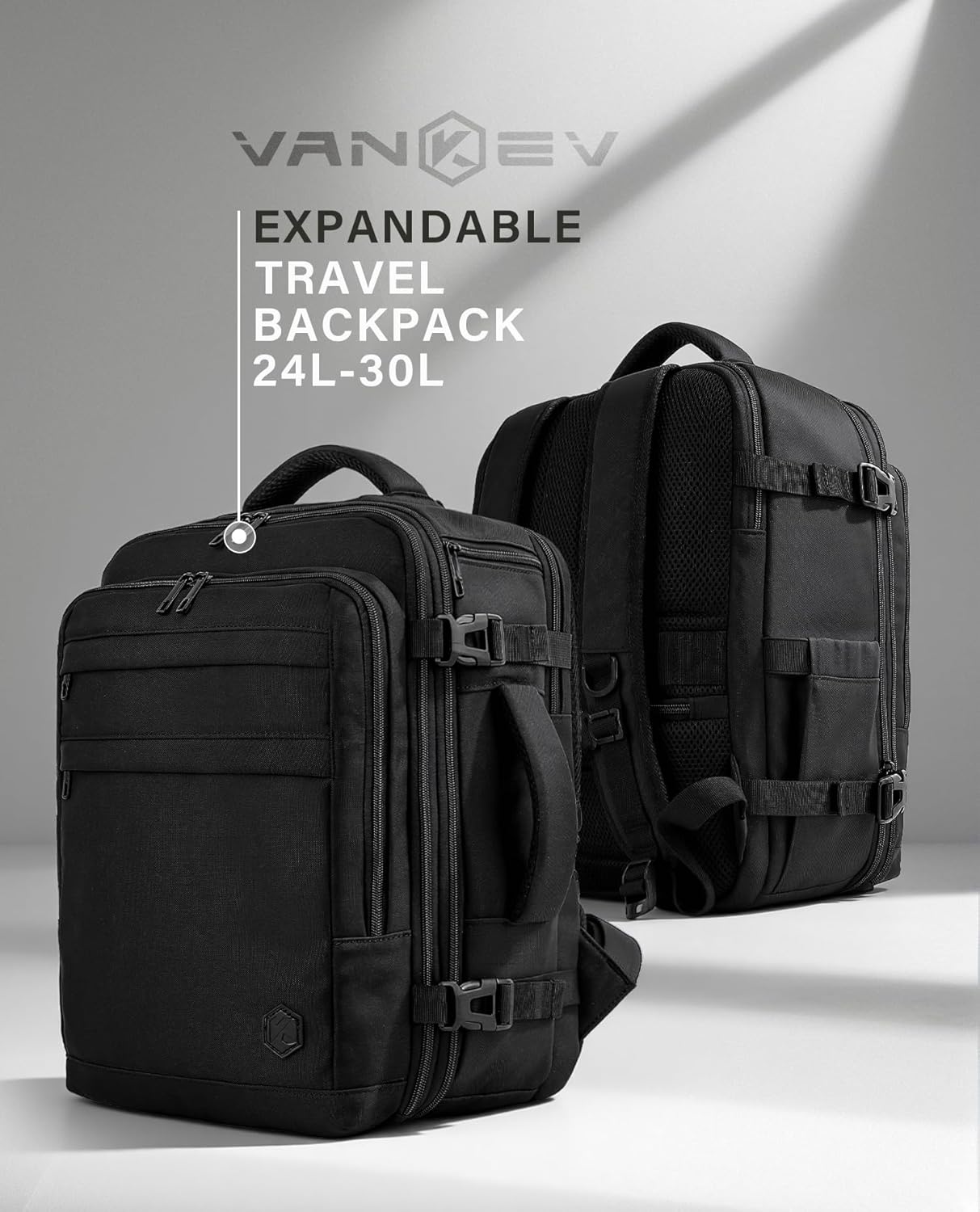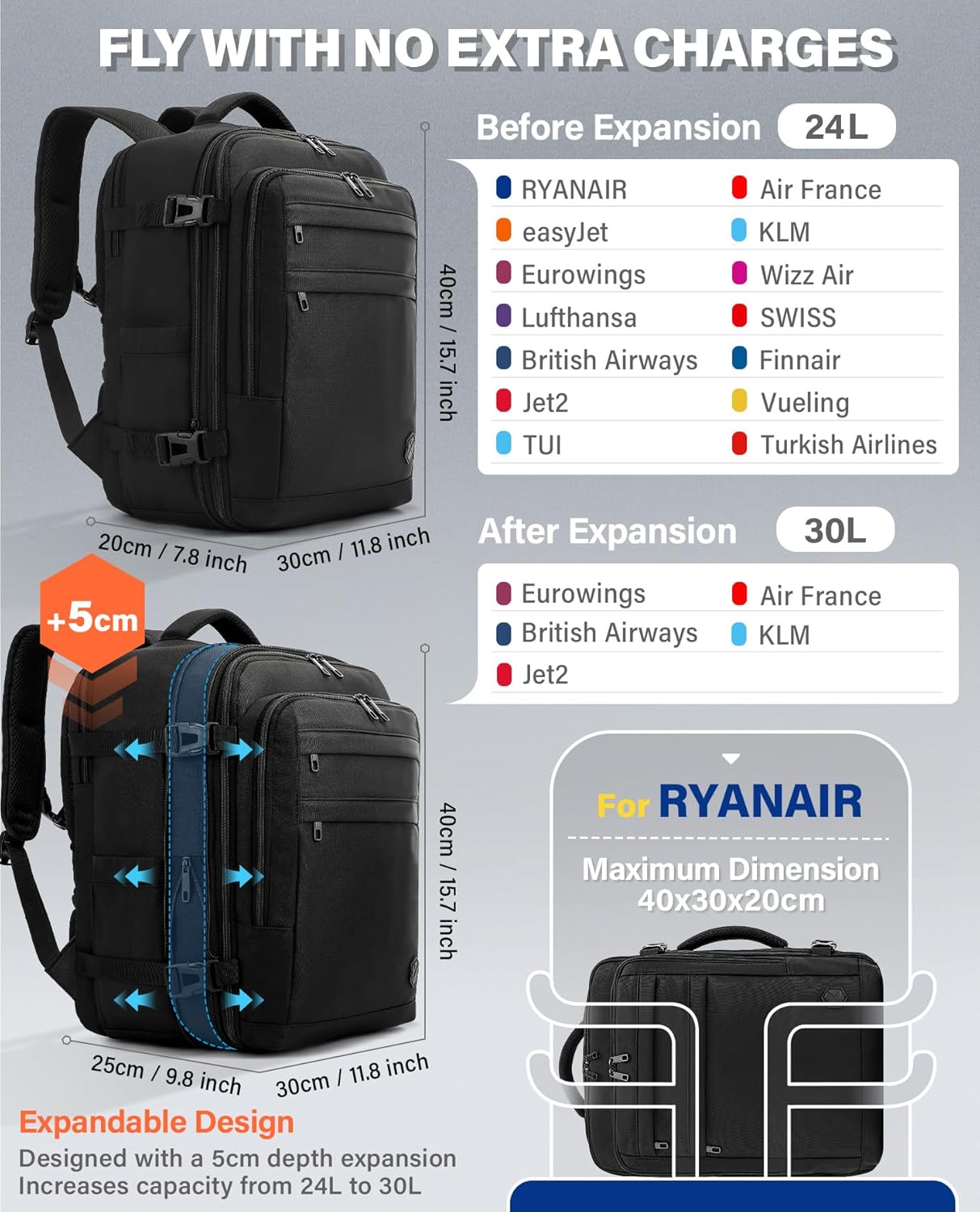 Ideal Size & Expandable Design: The standard size of this VANKEV cabin bag is 40x30x20 cm, which meets the carry-on requirements of Ryanair, EasyJet,Eurowings, Wizz Air, and Vueling. Specially designed with a 5cm depth expansion (to 40x30x25cm), it increases capacity from 24L to 30L. After expansion, it still ideally fits the carry-on requirements of Eurowings, Jet2, and Air France—ensuring easy slipping under the seat or into the overhead bin to avoid extra baggage fees