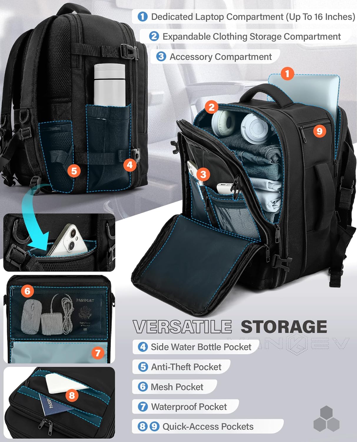 Smart Pack & Versatile Storage: Features 3 main compartments, including a front accessory compartment, an expandable clothing storage compartment (with 1 waterproof pocket and 1 mesh pocket), and a dedicated laptop compartment (up to 16 inches)—along with 3 exterior quick-access pockets, 1 side water bottle pocket, and 1 anti-theft pocket. By combining this expandable compartment with a multi-pocket design, it not only enables classified storage but also meets the need for spacious capacity