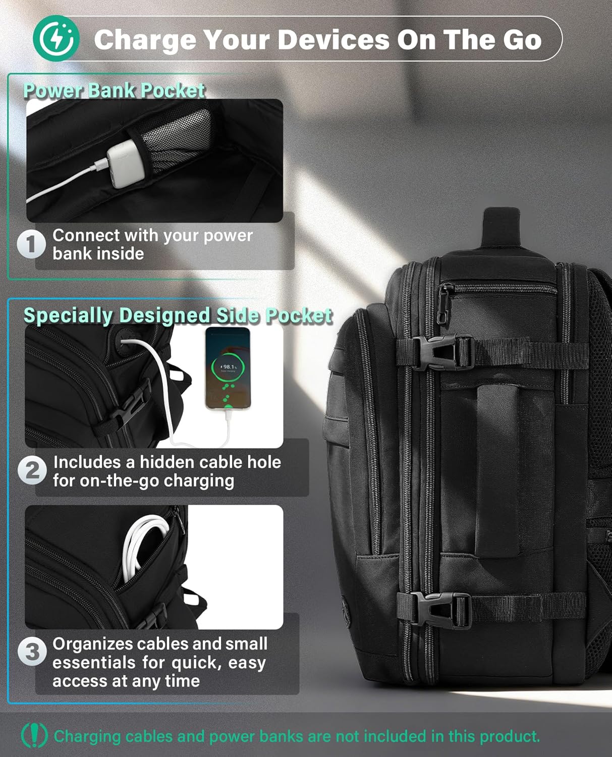 Security & Convenience: Featuring a TSA-approved design with a 180° full opening for quick security checks, it also includes an anti-theft pocket and a luggage strap to enhance convenience and safety. Additionally, a specially designed side pocket includes a hidden cable hole for on-the-go charging, while neatly organizing cables and small essentials for quick, easy access at any time (Note: Does not include charging cables or power banks.)