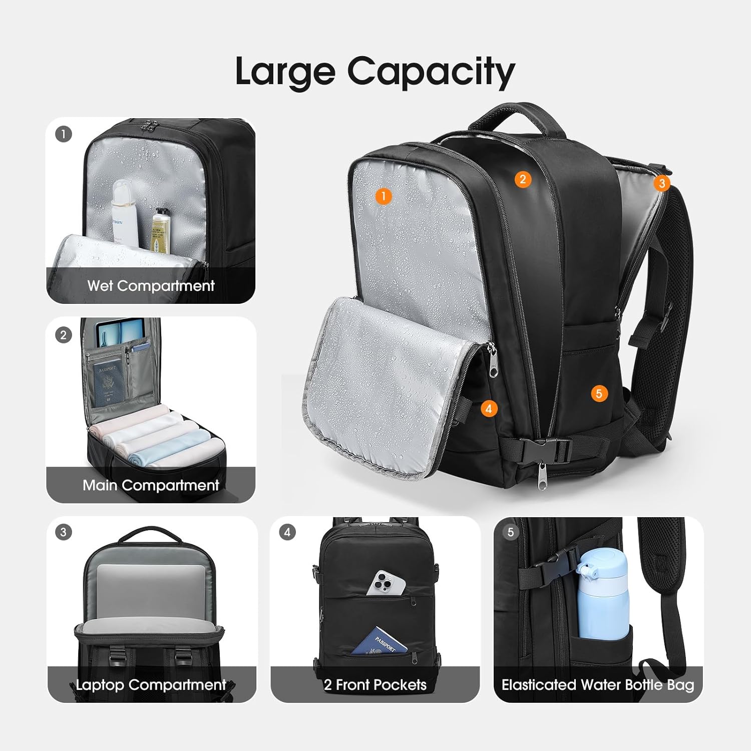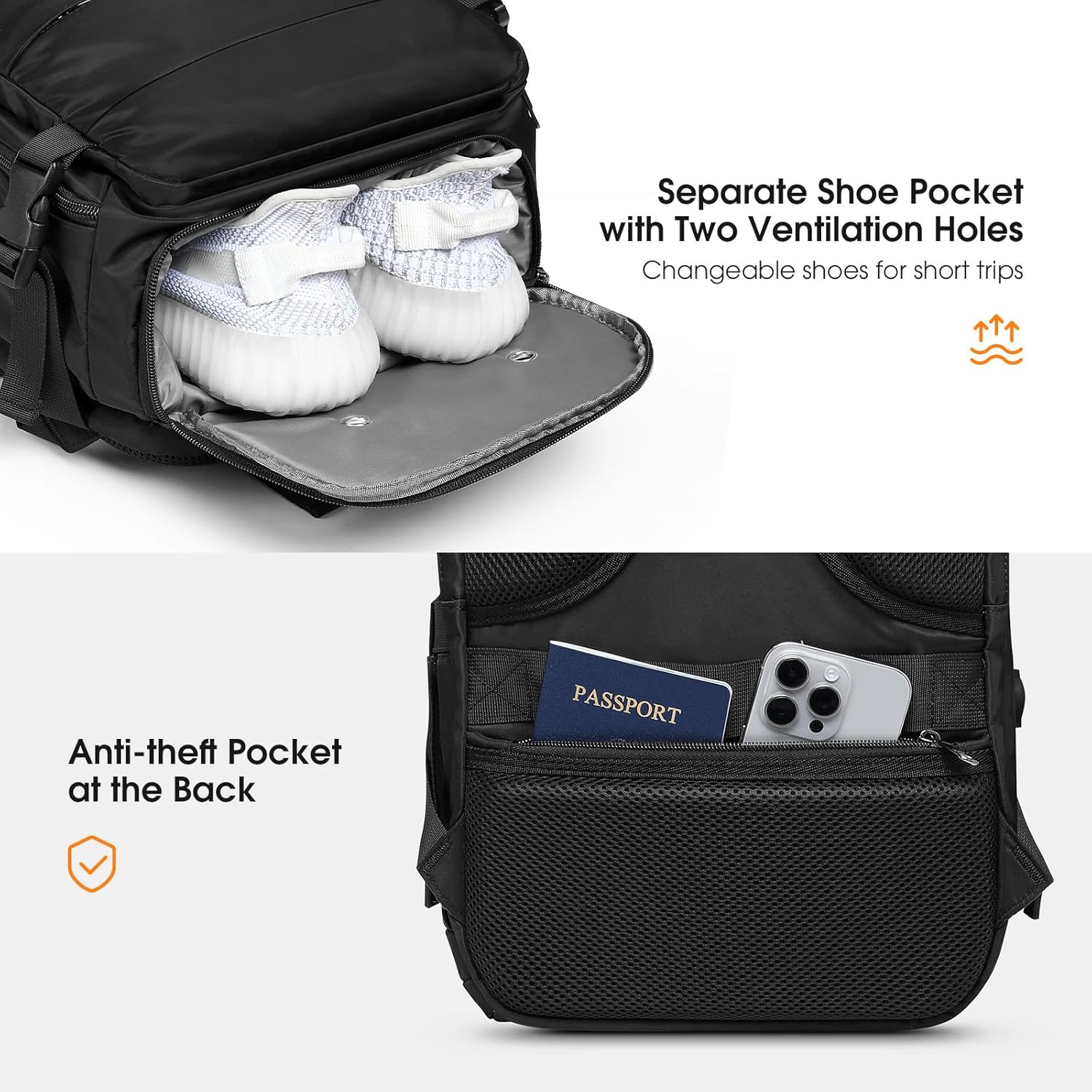 Smartly organised: This travel backpack boasts three handy compartments, dedicated document pockets, and tech pockets perfect for your gadgets. The spacious main compartment opens like a suitcase for easy packing, while elastic straps secure bulky items like shoes and clothes. Side compression straps let you adjust for extra luggage, transforming this into a rucksack for plane hand luggage or a practical underseat luggage solution. Our boarding bags with back anti-theft pockets ensure your travelling safety.