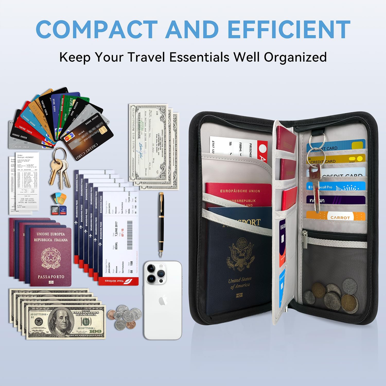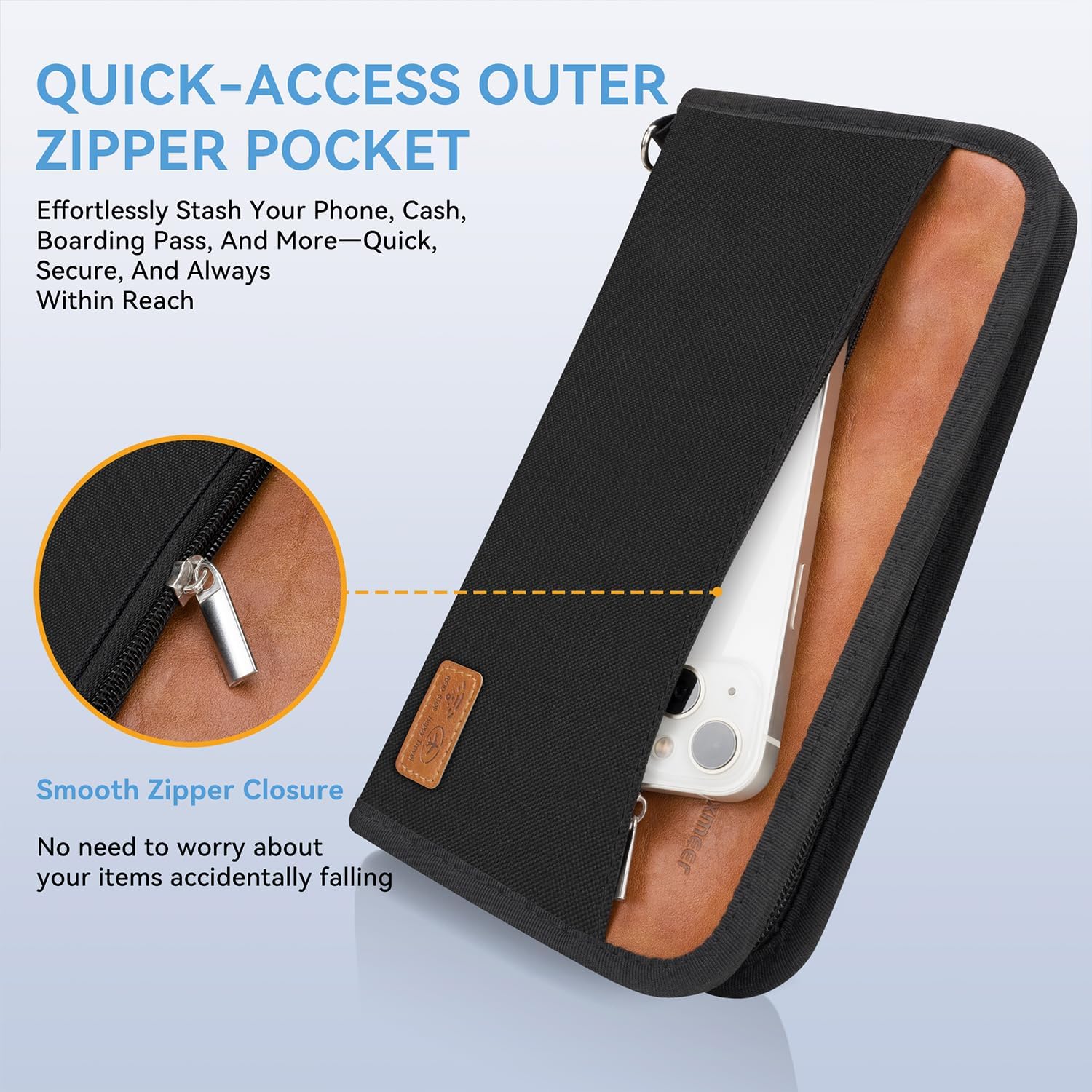 💯 𝐂𝐨𝐧𝐯𝐞𝐧𝐢𝐞𝐧𝐭 𝐐𝐮𝐢𝐜𝐤-𝐚𝐜𝐜𝐞𝐬𝐬 𝐏𝐨𝐜𝐤𝐞𝐭: There’s a quick-access outer zippered pocket on the front of the travel wallet, designed for easily reaching your travel essentials—such as your phone, boarding pass, airline tickets, or other important personal items—for instant use.