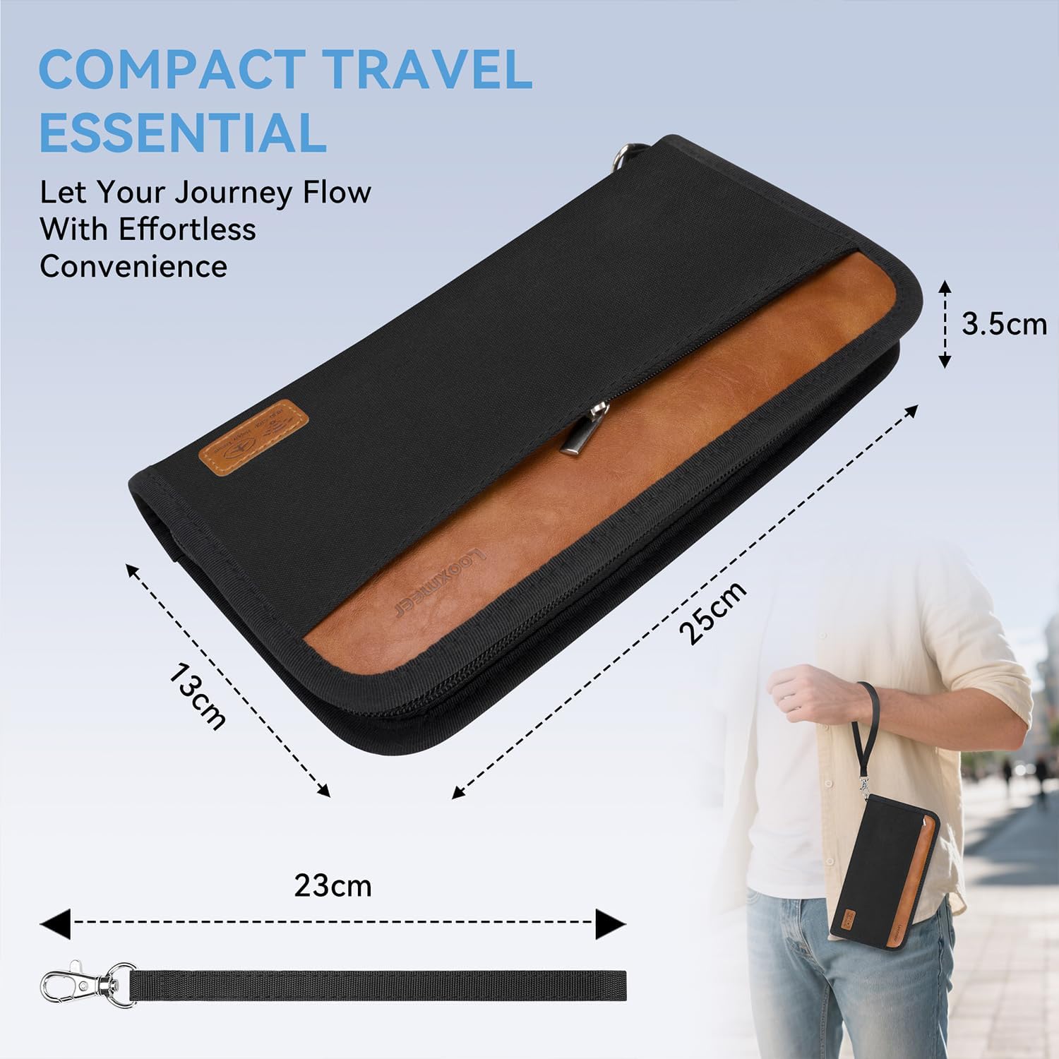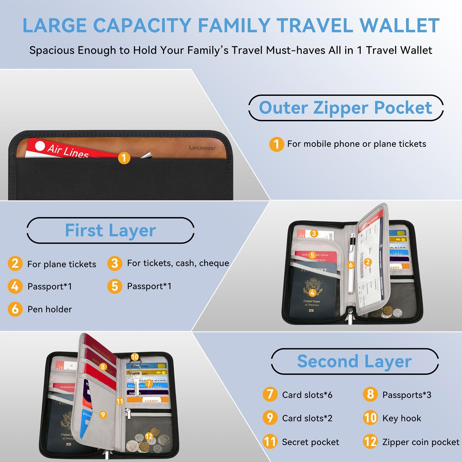 👜 𝐄𝐱𝐭𝐫𝐚 𝐋𝐚𝐫𝐠𝐞 𝐂𝐚𝐩𝐚𝐜𝐢𝐭𝐲 𝐅𝐨𝐫 𝐅𝐚𝐦𝐢𝐥𝐲: The Looxmeer passport wallet measures 25 x 13 x 3.5cm, providing ample space for 5 passports, 8 cards, 8+ boarding passes, keys, coins, pen holder and a special outer zippered pocket for tickets, cash, phones and other travel essentials. As an ideal passport organiser for large families, this all-in-one wallet eliminates scattered belongings and chaotic family travel.