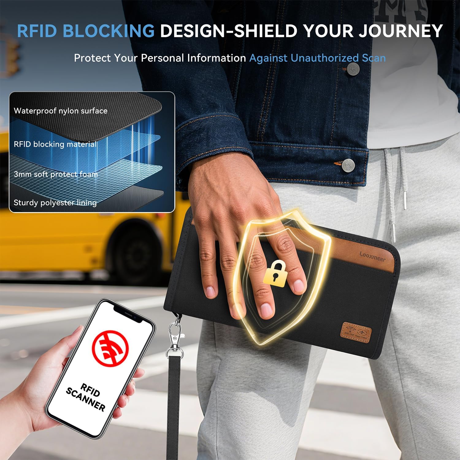 🔒 𝐇𝐢𝐠𝐡 𝐒𝐞𝐜𝐮𝐫𝐢𝐭𝐲 𝐑𝐅𝐈𝐃 𝐁𝐥𝐨𝐜𝐤𝐞𝐫: The Looxmeer passport holder features RFID-blocking technology. It protects your personal info from the RFID reader or unauthorized scanning, guarding against identity theft.