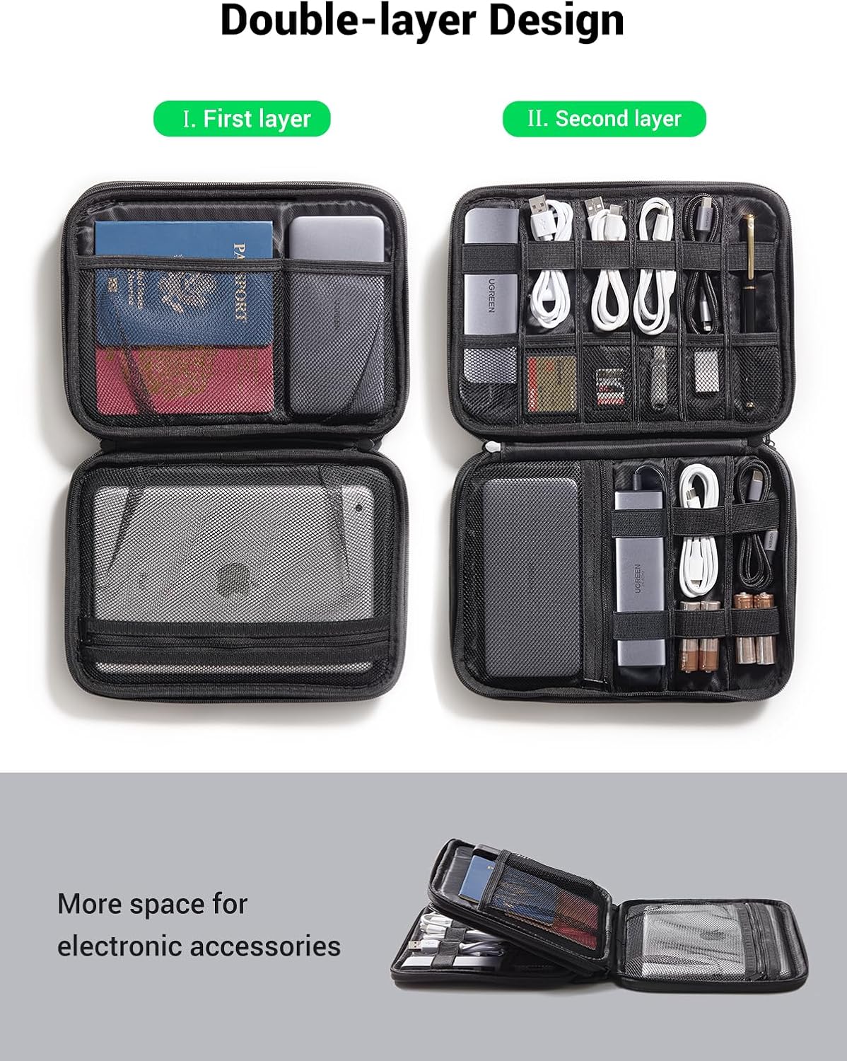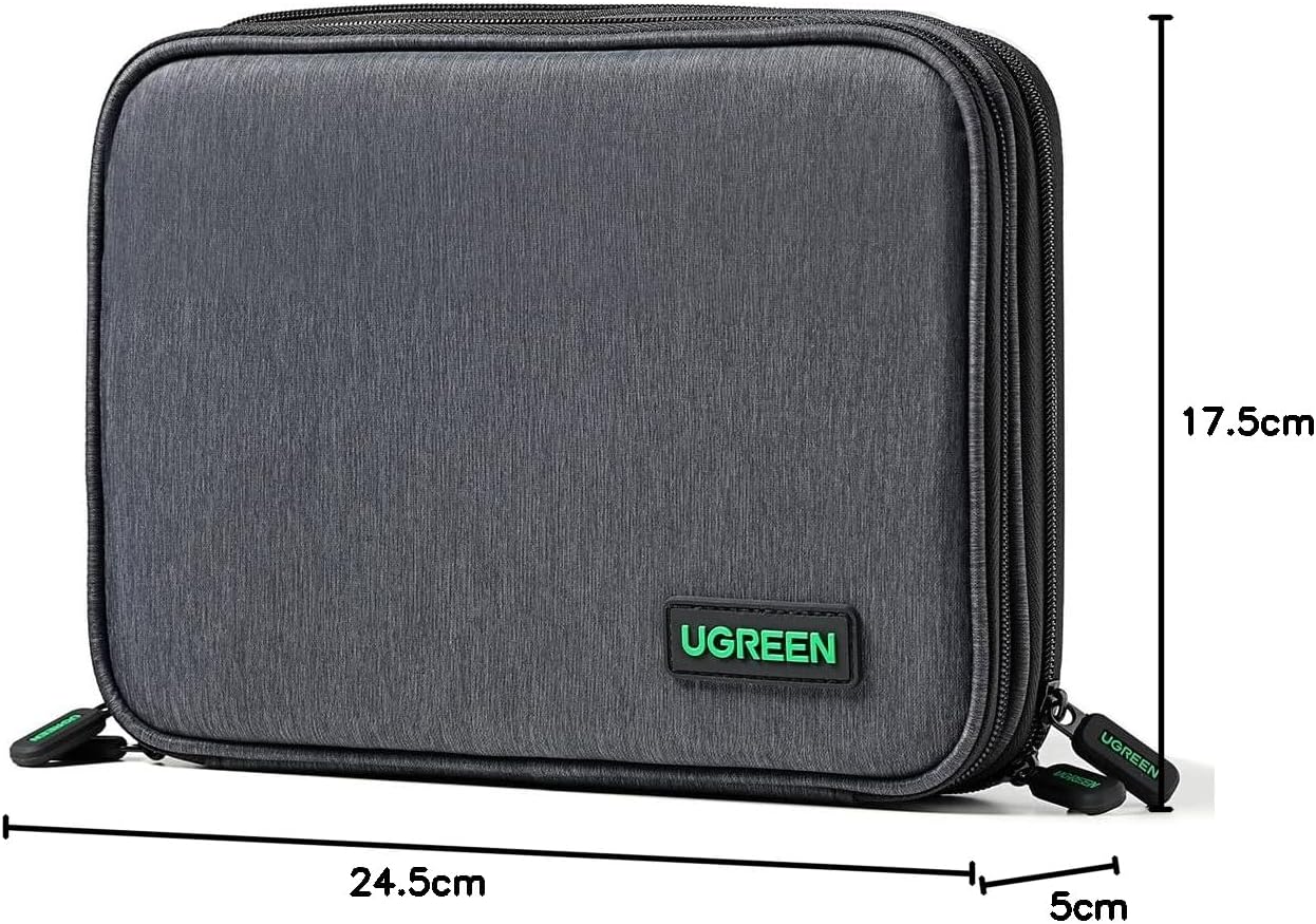 Storage Space: Dimension: 24.5 x 5 x 17.5mm, UGREEN Travel Cable Organizer is suitable for small electronics accessories, like cables, flash drives, and memory cards. The other side is designed to store larger compartments, like power banks, HDDs and tablets, etc.