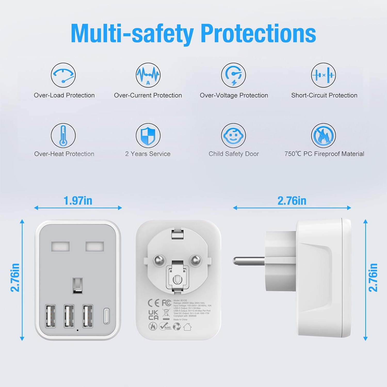Safe and Reliable – Omivine UK to EU plug adapters have built-in multi-protection, overload/over-current/over-voltage/short-circuit/over-heat protection, and are designed with a child-safe shutter. 750°C flame retardant housing is made from robust and high-quality plastic to resist high temperatures and eliminate fire hazards. Multiple protections for you and your children.