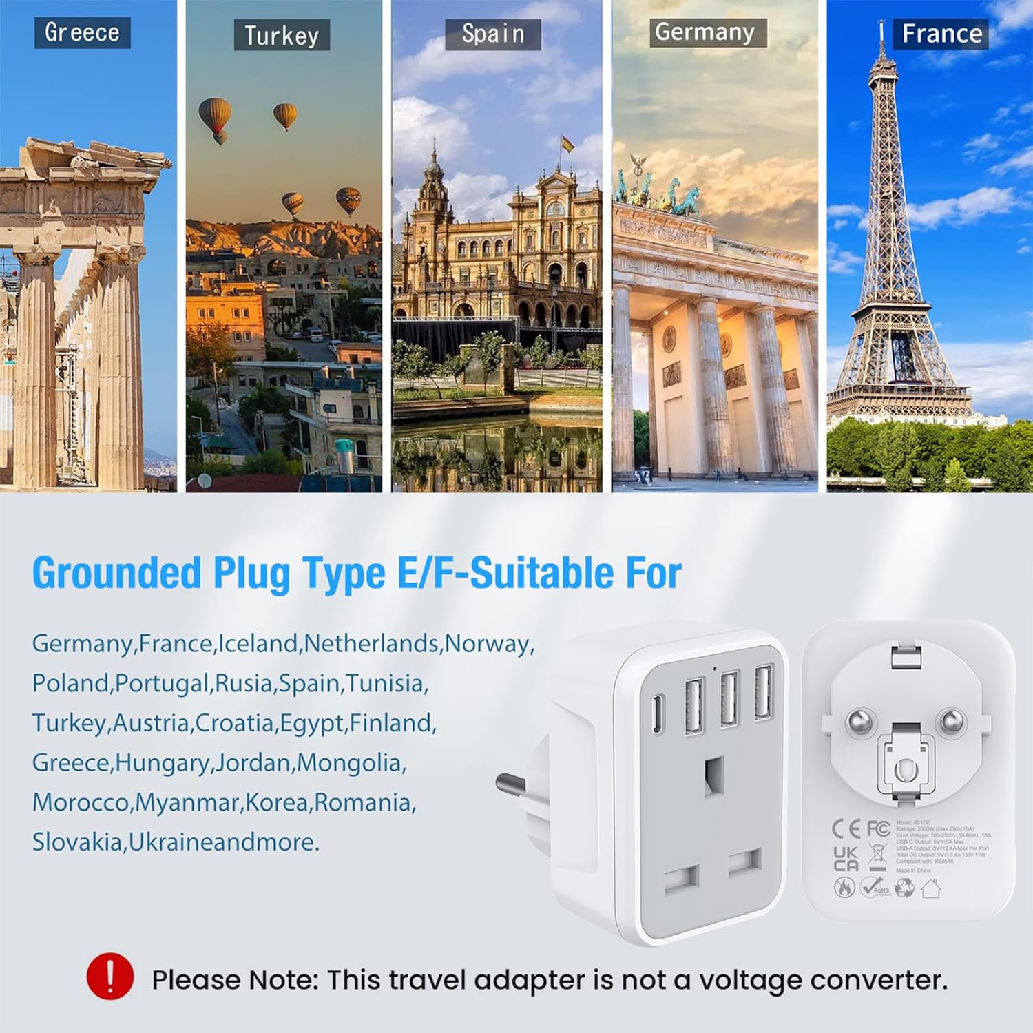EU Grounded Type E/F Plug Adapter – The European plug adapter can be compatible with most Europe countries such as Germany, France, Spain, Greece, Iceland, the Netherlands, Norway, Poland, Portugal, Estonia, Ethiopia, Morocco, Denmark, Belgium, Turkey, Finland, Sweden and more countries using E/F plugs. (Not for Italy, Switzerland, etc. )