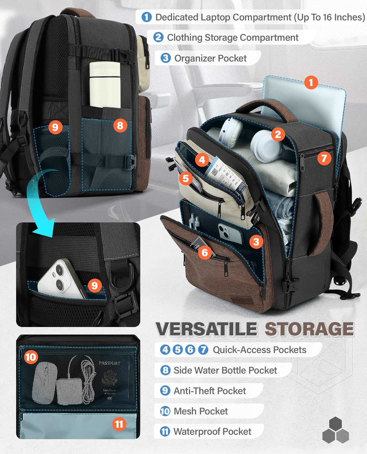 Multi-pocket & Efficient Storage:Equipped with 2 main compartments—a clothing storage compartment (which includes 1 waterproof pocket and 1 mesh pocket) and a dedicated laptop compartment (up to 16 inches), along with 1 organizer pocket, 4 quick-access pockets,1 side water bottle pocket, and 1 anti-theft pocket. This multi-pocket design not only enables efficient storage and classification of your items for quick and easy access at any time, but also improves space utilization
