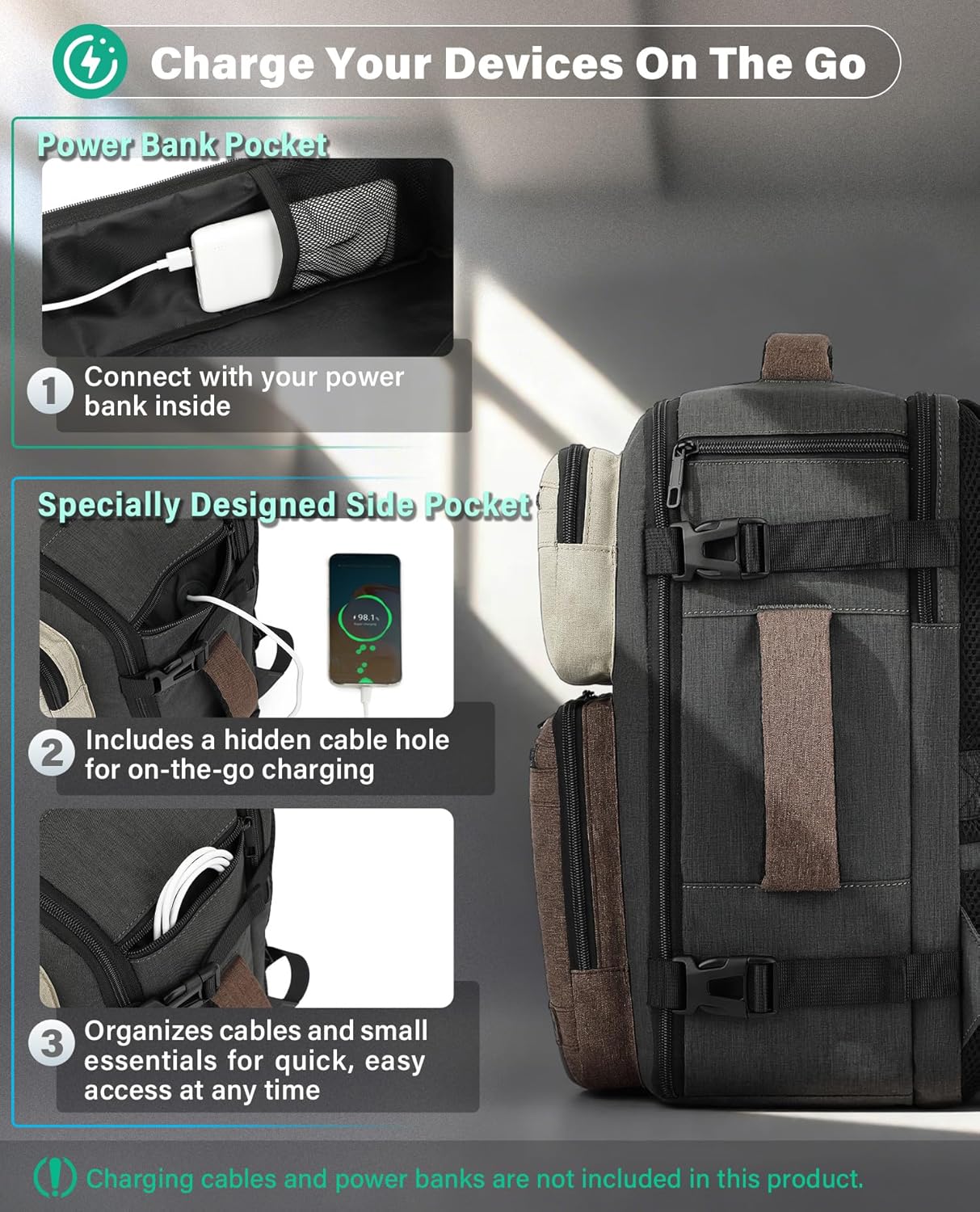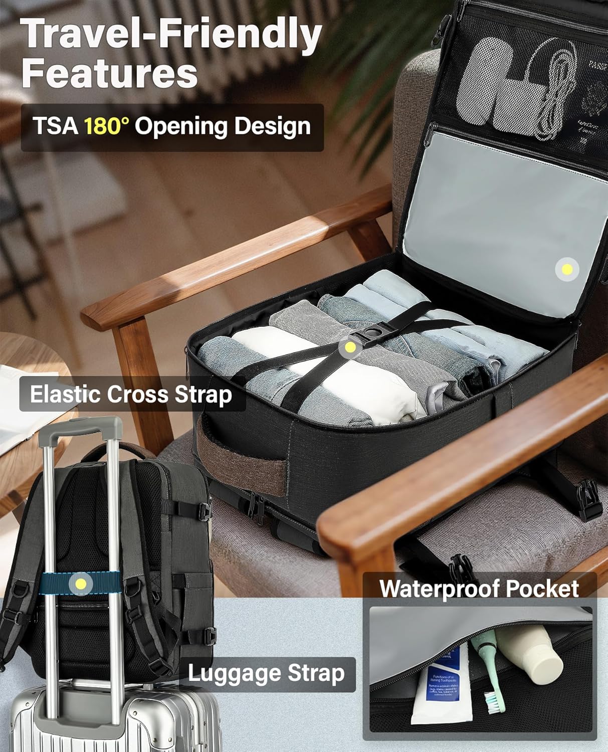 Security & Convenience: Featuring a TSA-approved design with a 180° full opening for quick security checks, it also comes with an anti-theft pocket and a luggage strap to enhance convenience and safety. Additionally, a specially designed side pocket includes a hidden cable hole for on-the-go charging, while neatly organizing cables (Note: Does not include charging cables or power banks.)