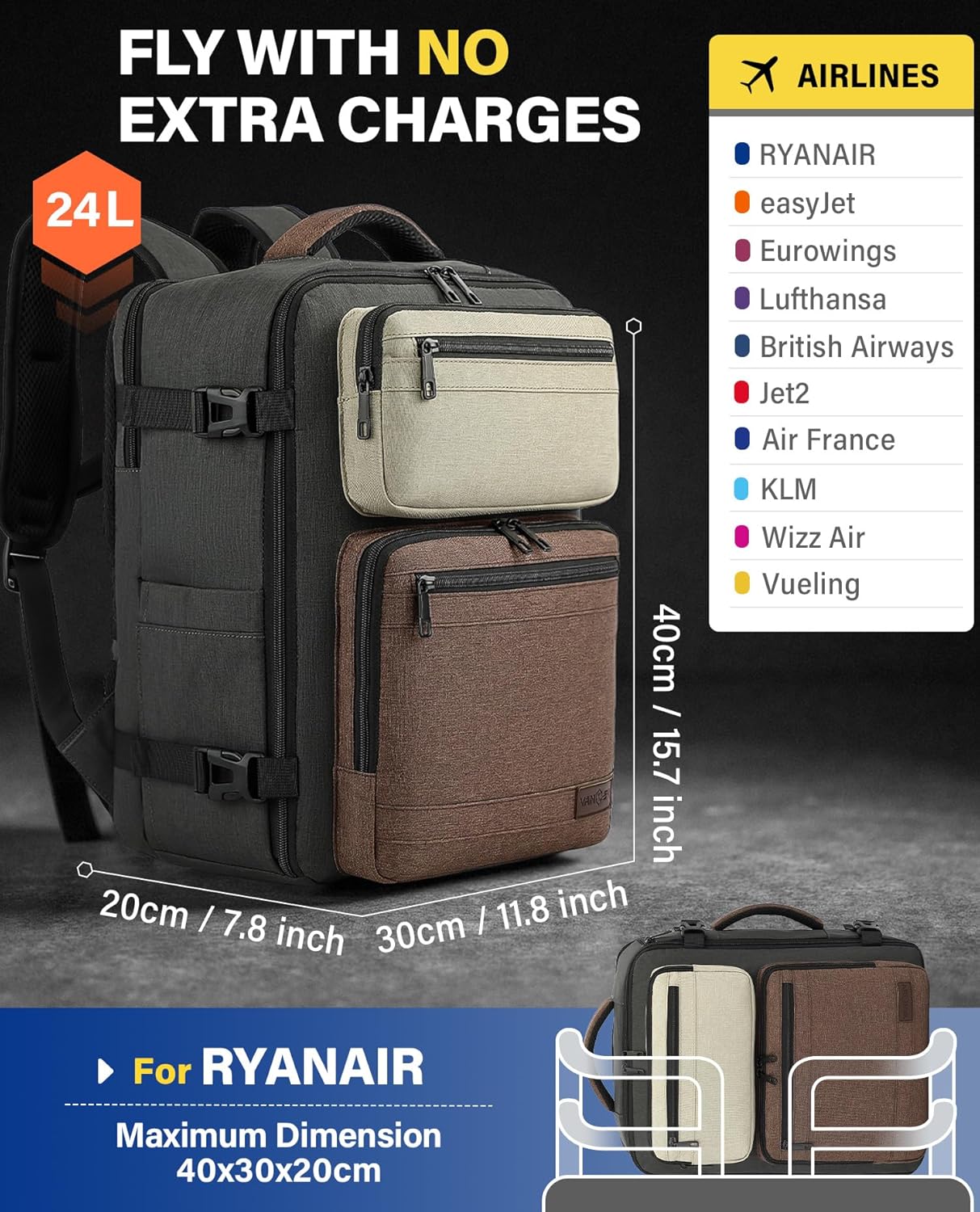 Ideal Cabin Bag Size: With dimensions of 40(L)x30(W)x20(D)cm and a 24L capacity, the VANKEV cabin bag features an ideal size that meets the carry-on luggage requirements of various airlines, including Ryanair, EasyJet, Eurowings, Lufthansa, Wizz Air, Vueling, and Jet2. This thoughtfully designed size allows it to fit effortlessly under the seat or in the overhead compartment, helping you avoid extra baggage fees