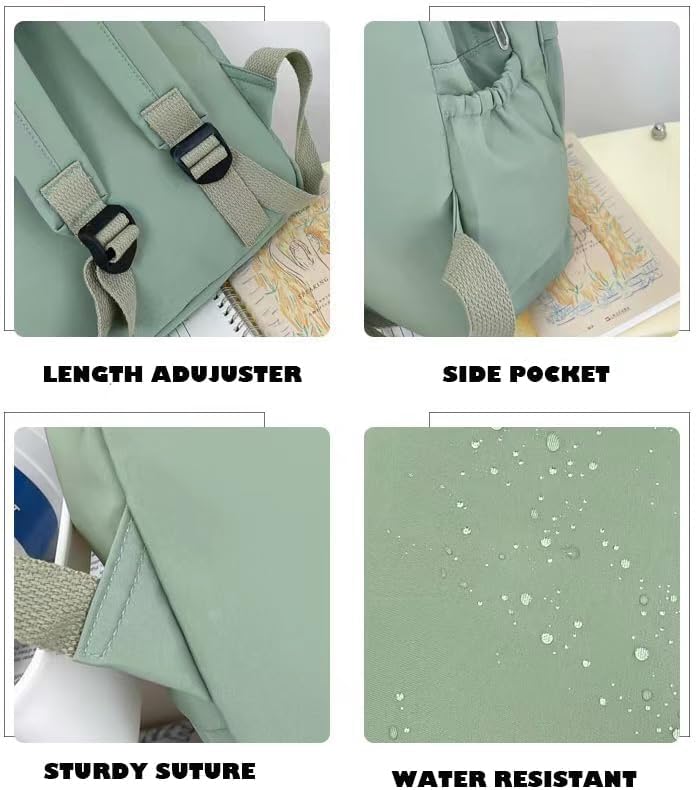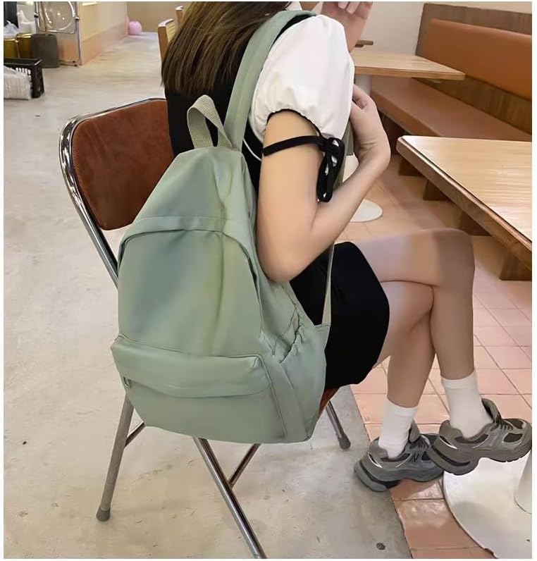 Sage green backpack shown from three angles - front, side, and back views - featuring minimalist design with main compartment, front pocket, and adjustable shoulder straps.Sage green backpack shown from three angles - front, side, and back views - featuring minimalist design with main compartment, front pocket, and adjustable shoulder straps.